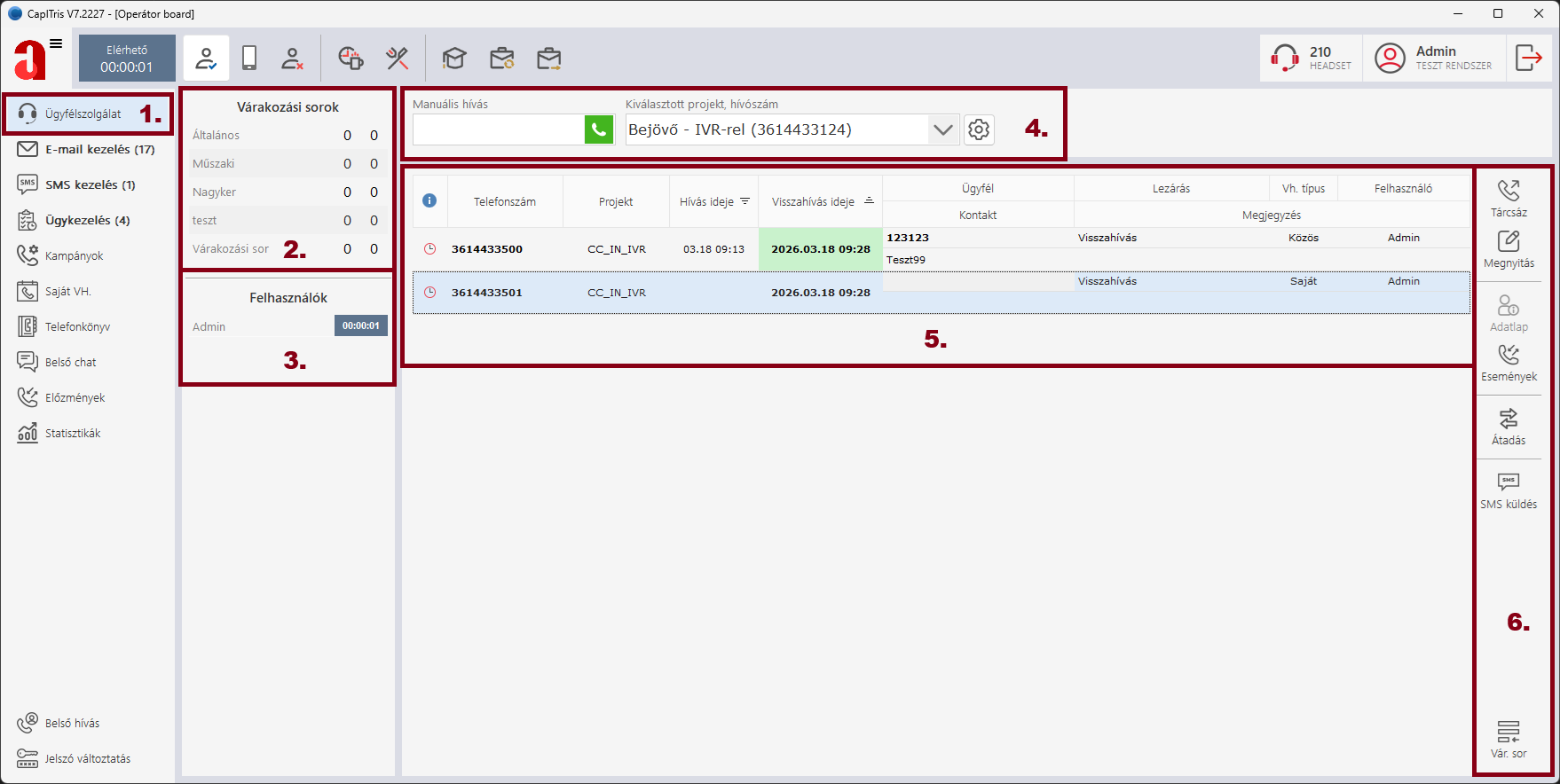 Ezen a felületen tudjuk fogadni és kezelni a bejövő hívásokat, és a bejövő projektekhez tartozó nem fogadott hívásokat, illetve visszahívásokat. Fontos, hogy bejelentkezés után a rendszer nem elérhető állapotban van, a hívások fogadásához szükséges az elérhető állapot kiválasztása!