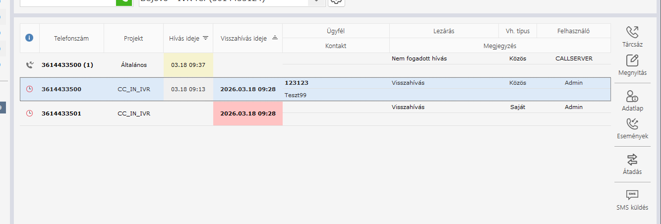 - Események: Az adott telefonszámhoz tartozó kontaktálási események listázása