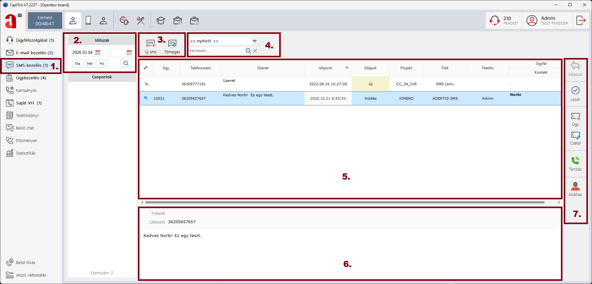 Az SMS kezelés fő ablaka az alábbi részekből épül fel: