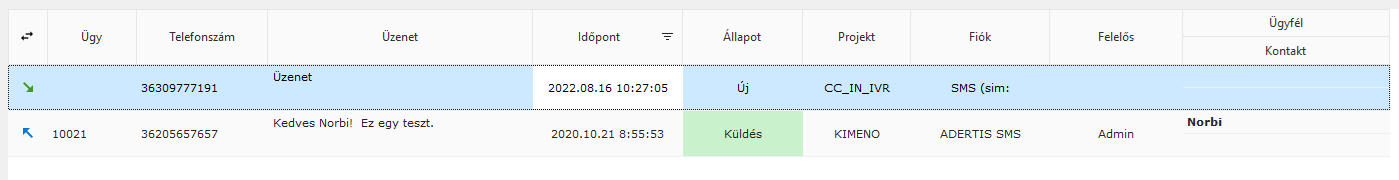 - Ügy: Ügy (hibajegy) nyitása az adott SMS-ből
