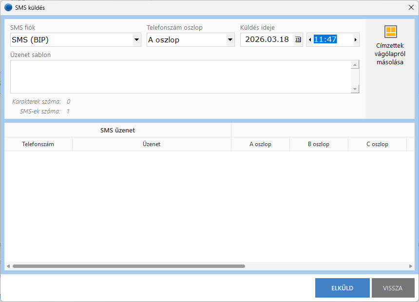 Tömeges SMS: Ehhez szükségünk van egy forrásfájlra - ez lehet például egy xls fájl - , ami tartalmazza a címzettek telefonszámát és egyéb opcionális adatait, fejléccel ellátva. Miután a felugró ablak felső részét (fiók, tel.szám oszlop, dátum, szöveg) kitöltöttük, vágólap használatával kell a címzetteket beolvasni a forrásfájlból.