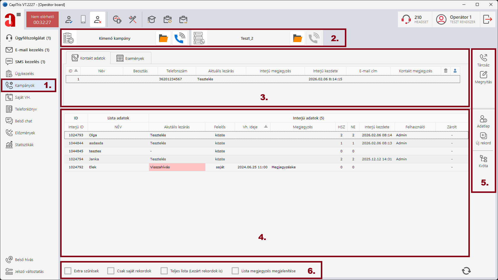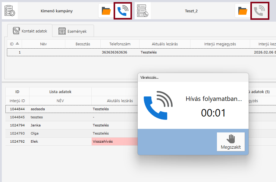 Ezen a felületen tudjuk kezelni a kimenő kampányokban indított hívásokat.