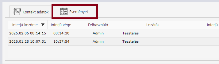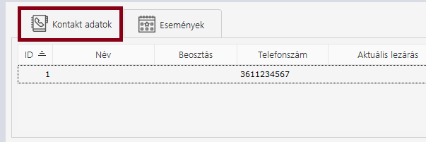 Itt megjeleníti a rendszer a kontakt adat nevét, beosztását, telefonszámát, továbbá az adott elérhetőséghez tartozó utolsó lezárást, időpontot, megjegyzést.