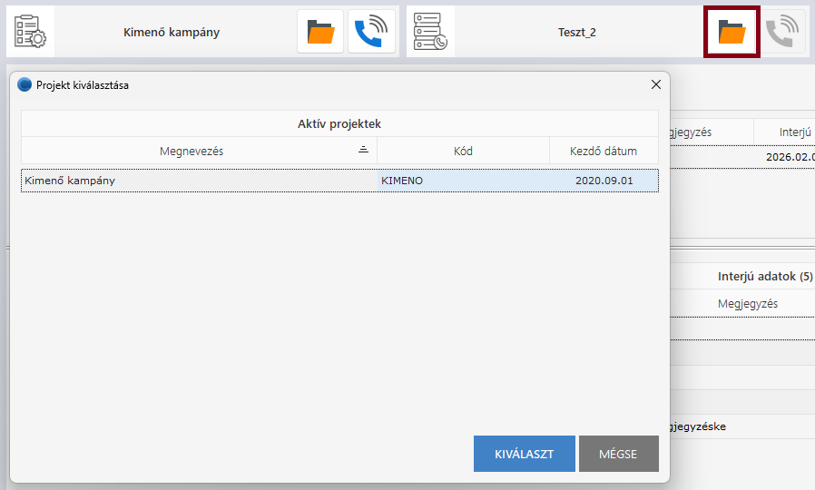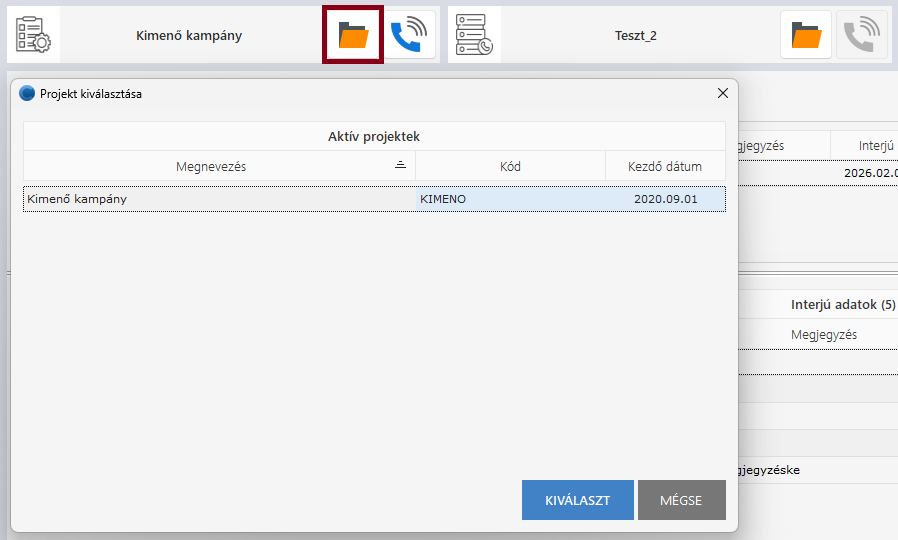 2. Projekt kiválasztás / Lista kiválasztás / Auto dial (prediktív tárcsázás)