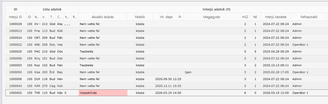 Fontos, hogy azok a visszahívások, melyeknek a visszahívás ideje a jövőben vannak, azok nem jelennek meg ezen a felületen. Csak az a felhasználó látja a saját visszahívásai között, aki az adott tétel felelőse.