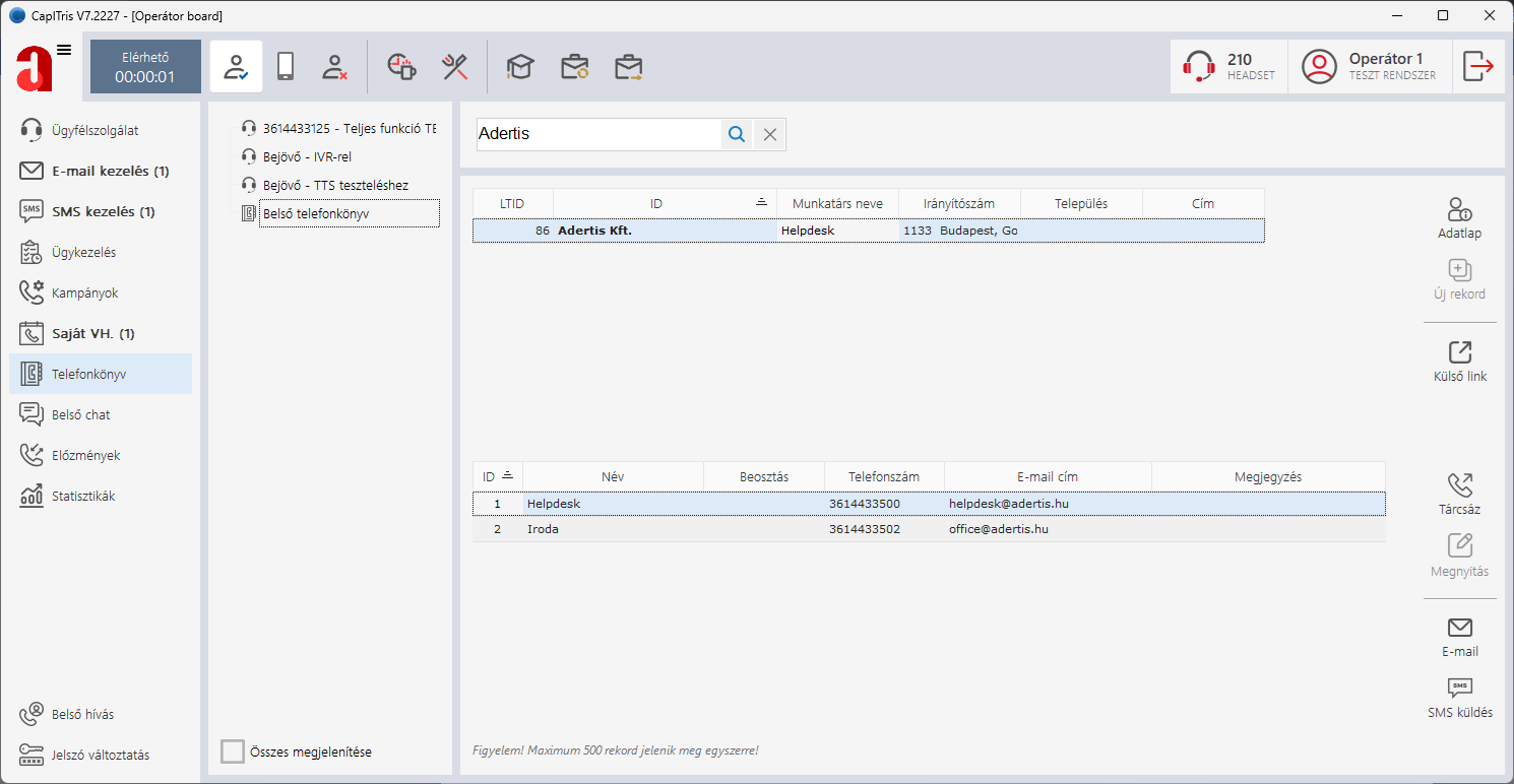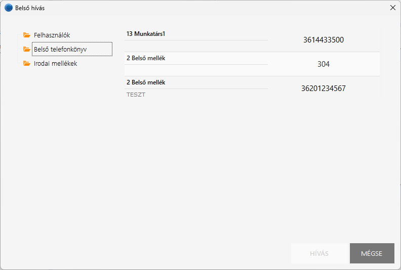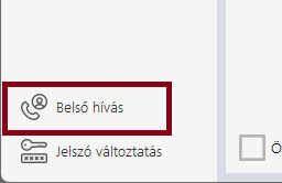 Lehetőség van belső hívásokat indítani. A funkció ablakot a bal alsó sarokban lévő gombbal lehet előhívni.
