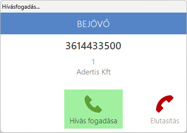 A rendszer a beérkező hívást hangjelzéssel, valamint felugró ablakkal jelzi. A felugró ablakban van lehetőségünk fogadni, vagy elutasítani a beérkező hívást.