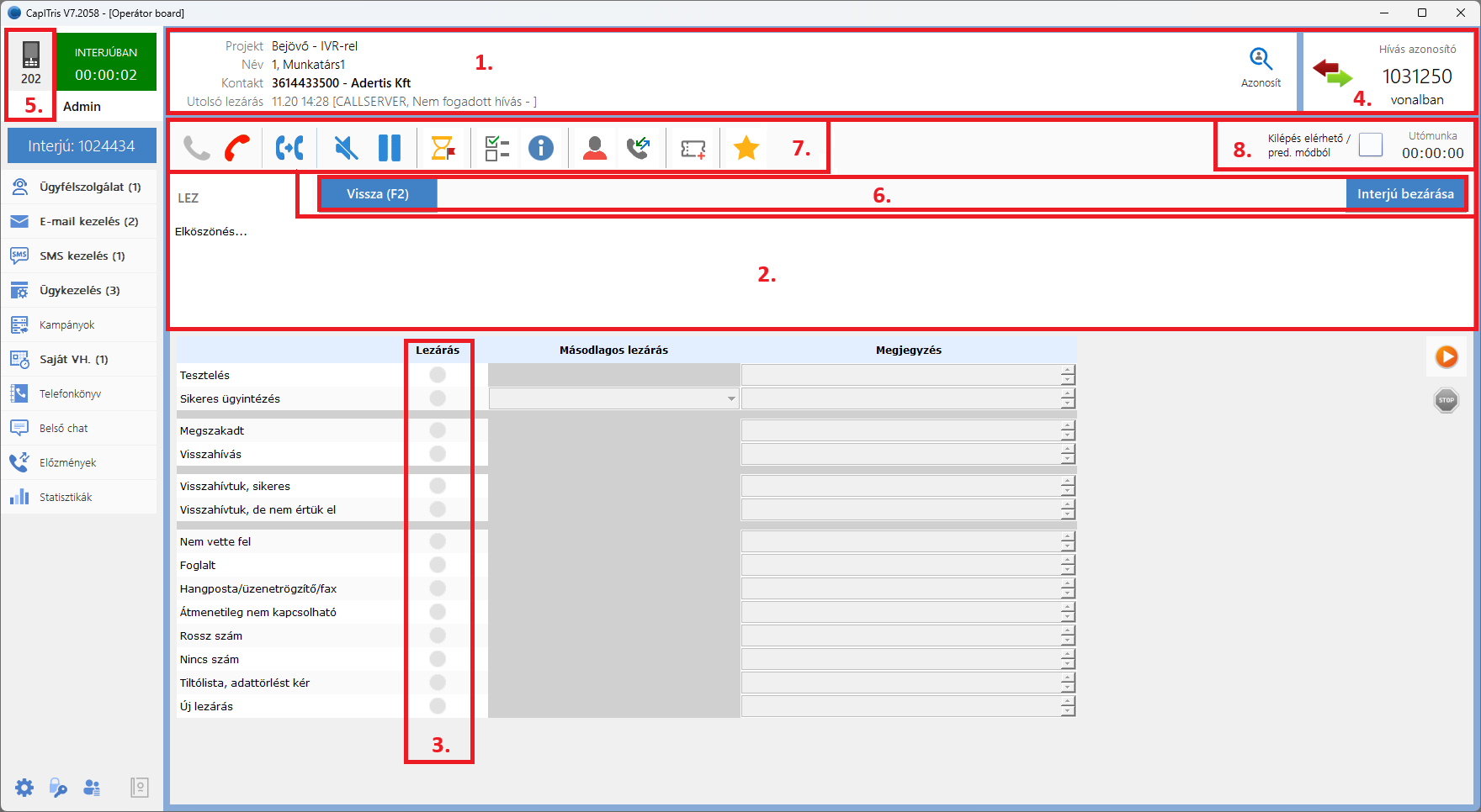 - Funkciógombok: Tárcsáz; Letesz; Átkapcsolás; Némítás; Tartás; Szkript adatok; Projekt információ; Adatlap; Telefonszám előzmények; Ügy (hibajegy) felvétele; Átkapcsolás értékeléshez.