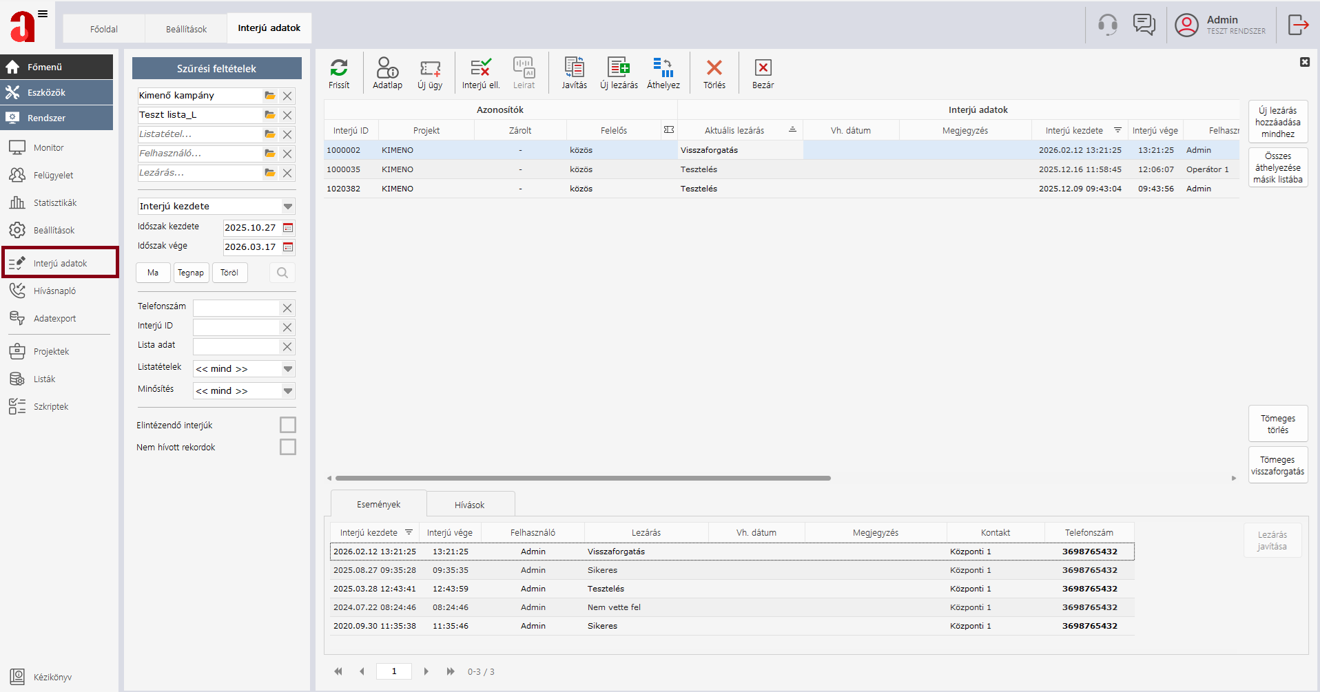 | Interjú ell. | Inteljú ellenőrzési lehetőség, láthatóak a listatétel és az interjú részletei, lehet módosítani az értékeket, valamint minősíteni lehet az interjút előre definiált kulcsszavakkal. |