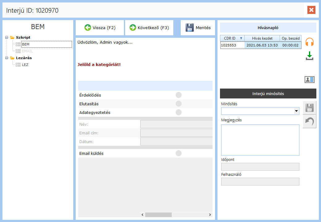 Az interjú megnyitásával látszódik a script felépítése, operátor által jelölt válaszok, lehetőség nyílik az adott interjú hanganyagának visszahallgatására, letöltésére, valamint az interjúztató operátor minősítése is rögzíthető. A minősítések testreszabhatók a Csoportok --> QM minősítések alatt.