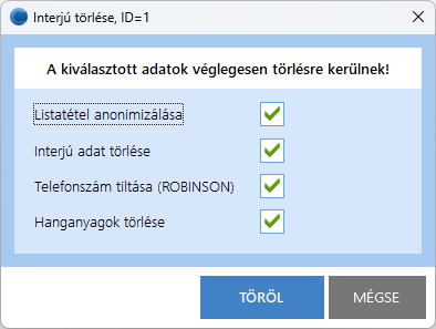 | Telefonszám tiltása (ROBINSON) | A törölt interjúhoz tartozó telefonszámot tiltólistára teszi a rendszer, hogy a jövőben ne lehessen arra hívást indítani. |