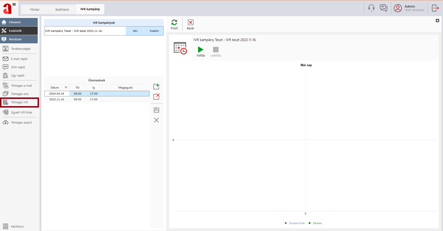 Az IVR kampányok felügyelete az alábbi modulok kezelésével lehetséges: