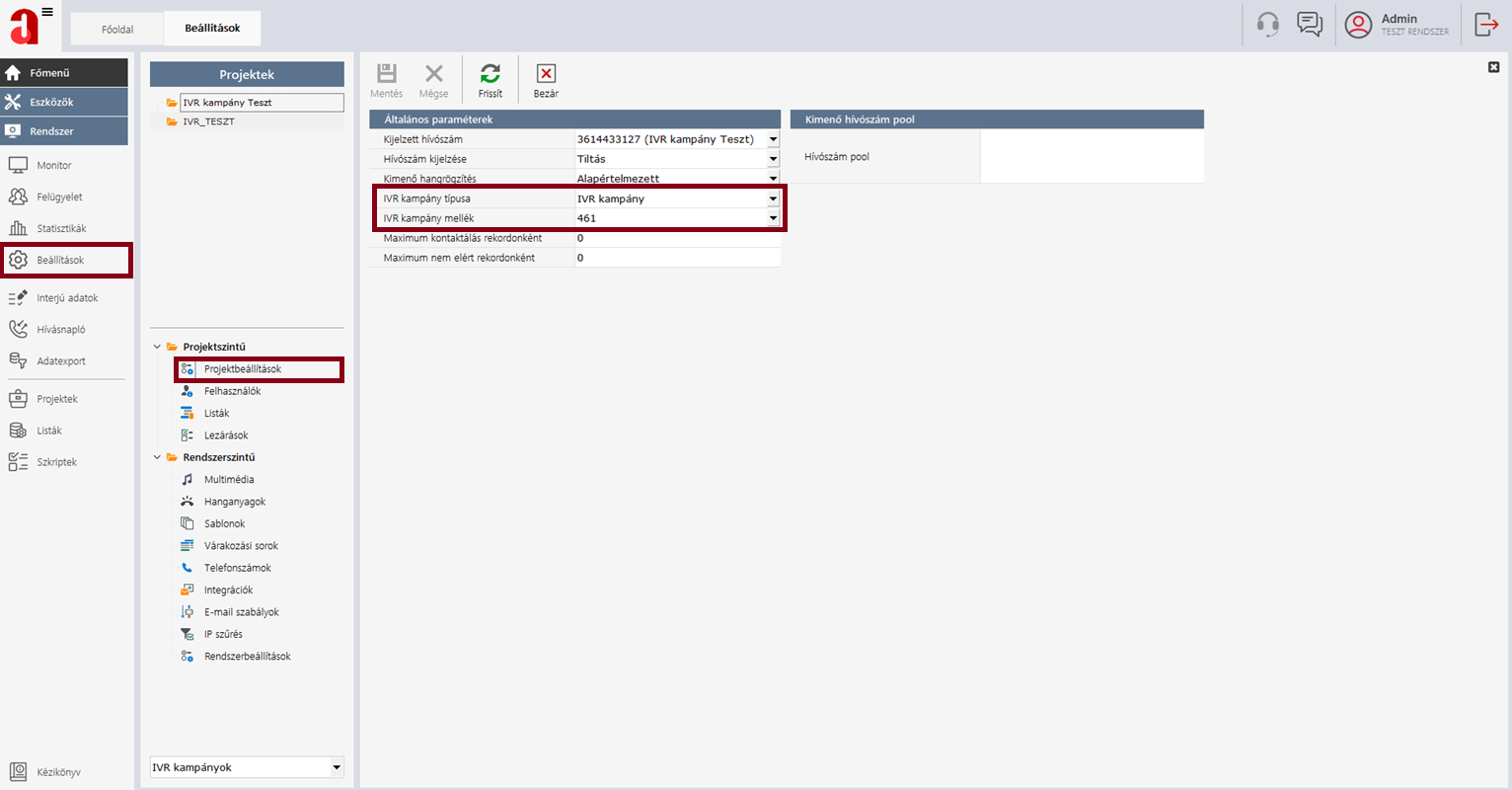 A létrehozott projektet paraméterezni kell a Főmenü --> Beállítások --> Projektbeállítások alatt. Az általános hívásbeállításokon túl az alábbi két paraméterre kell kiemelten figyelni: