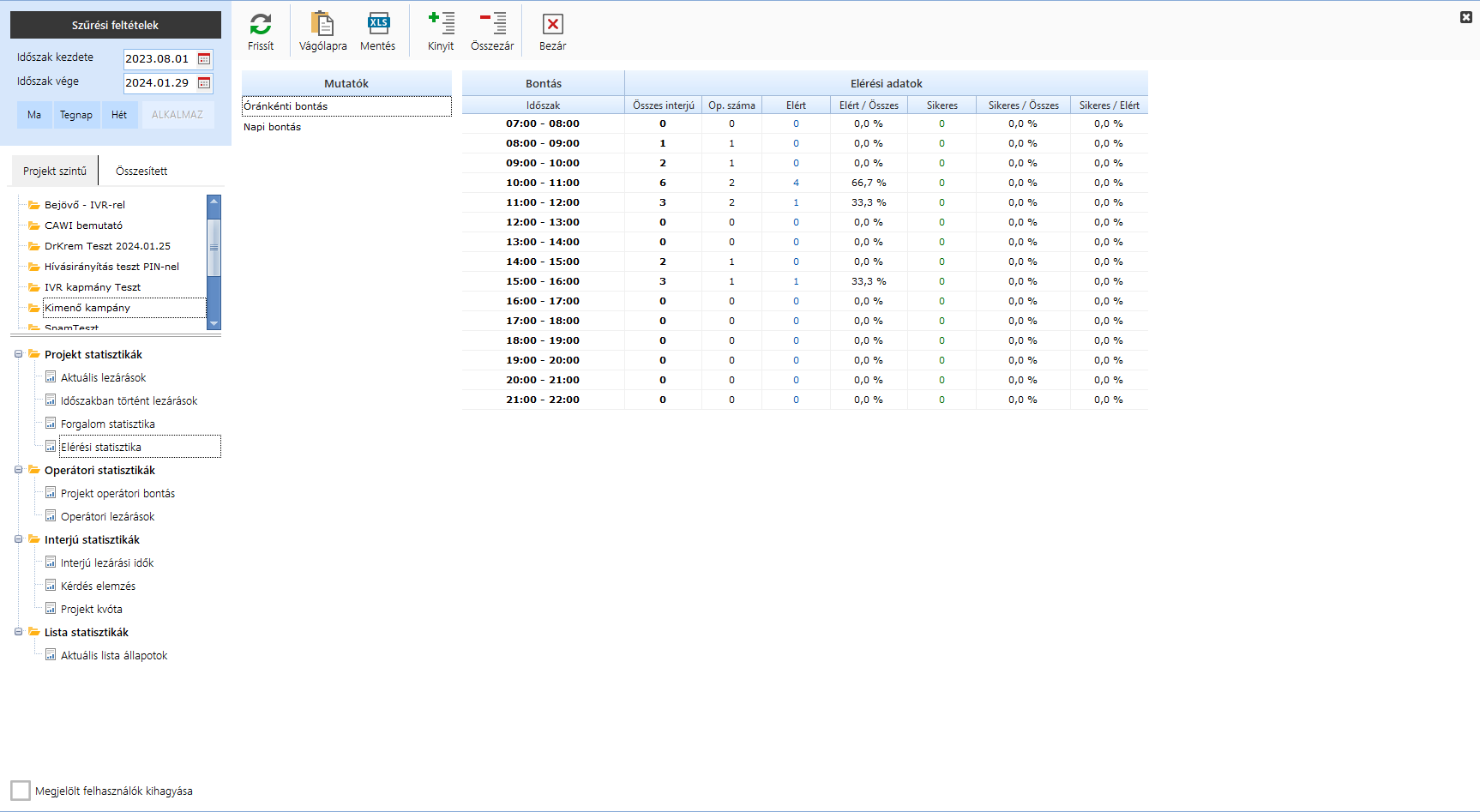 | Elért/Összes | Az elért hívások százalékos aránya az összes híváshoz viszonyítva. |