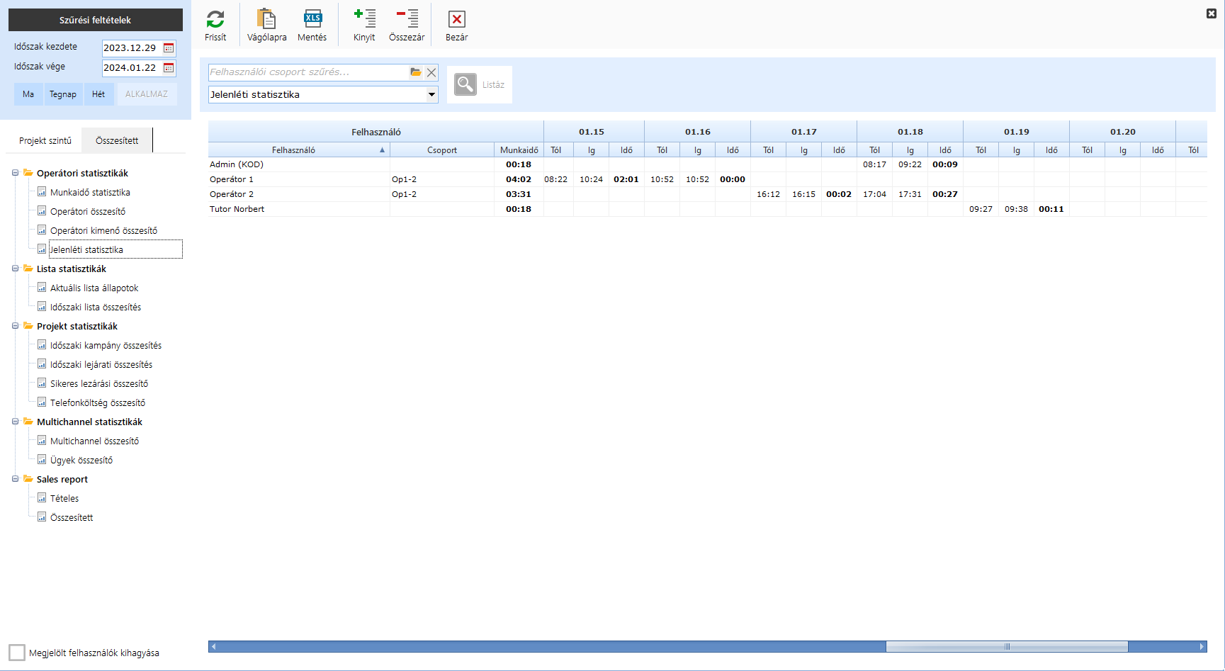 A jelenléti statisztikában projektektől függetlenül, napi bontásban tekinthetjük meg az operátor bejelentkezési és kijelentkezési időpontját, illetve annak időtartamát. A legördülő menüben az "Első/utolsó hívás (jelenlét)" opciót választva pedig az adott időszakban a felhasználóhoz tartozó hívások darabszámát láthatjuk.