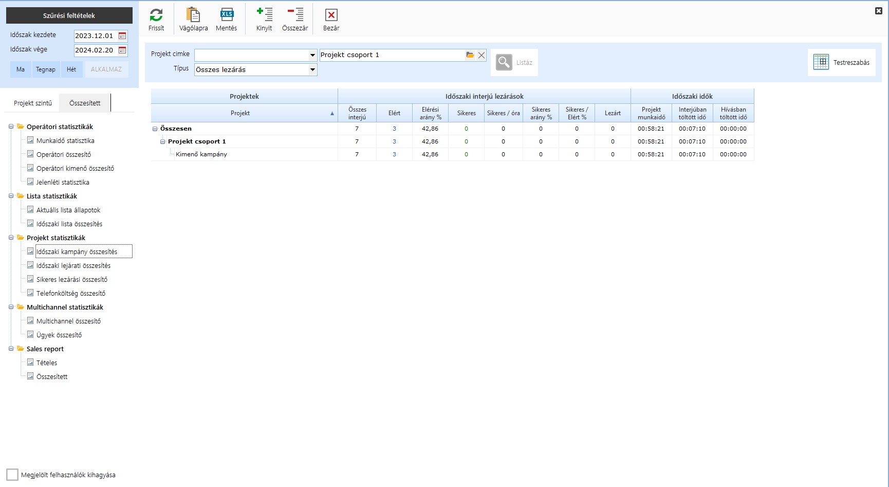 A kampányok adott időszakra vonatkozó lezárási adatait és a projekt időket mutatja.