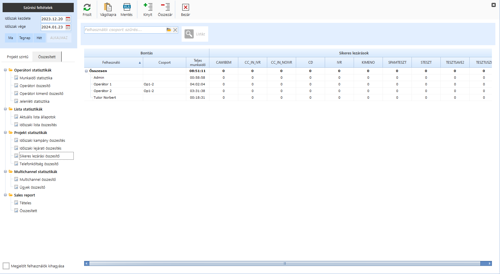 A kampányok sikeres lezárásait és az adott időszakra vonatkozó Teljes munkaidőt tekinthetjük meg operátori bontásban. A projektenkénti bontás projektkód szerint történik.