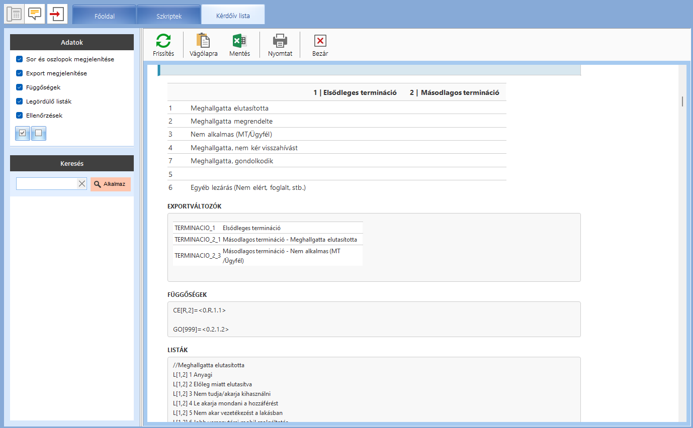 Lehetőségünk van a leprogramozott szkriptből szöveges kérdőívet kapni, ha a nyomtatás gombra kattintunk. A modulon belül eldönthetjük, hogy a szkript mely részeire van szükségünk.