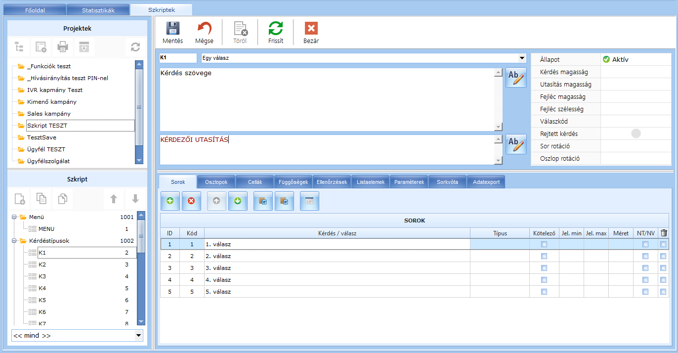 | Kérdés állapota | Három állapot van (ikonok jelzik), aktív, tesztelés alatt, kukázott. A kukázott állapotú kérdés nem jelenik meg, a "tesztelés alatt" lévő megjelenik, de a programozónak jelzi, hogy még nincs teljesen kész. |